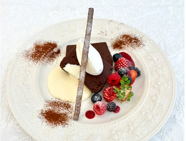 テリーヌショコラの生クリームとフルーツ添え スペキュロスと2色のソースと共に 1600円