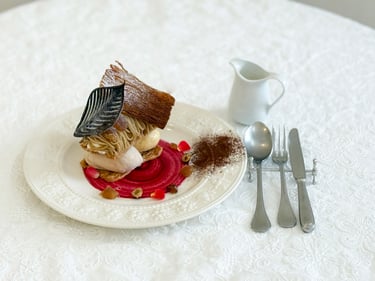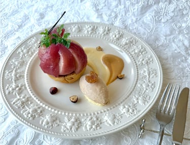 自家製濃厚な栗とバニラの2種類のアイスクリームと和栗のペーストを使った栗のミルフィーユを一皿に盛り合わせ、キャラメリゼしたナッツ、マロングラッセを添えました。