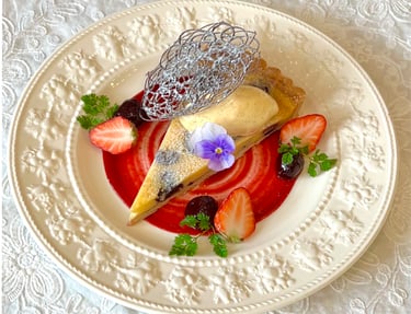 洋梨とキャラメルを入れて焼き上げたタルトにクレムーをのせ、赤ワイン、シナモン、オレンジ等で香り付けした洋梨をあしらったタルトです。