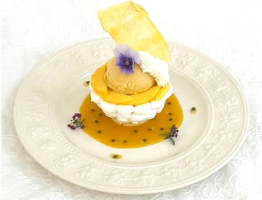サクサクに焼き上げたメレンゲにカスタードクリーム、生クリーム、マンゴーとパッションフルーツのシャーベット、フレッシュフルーツを盛ったフランス定番の皿盛りデザートです。
