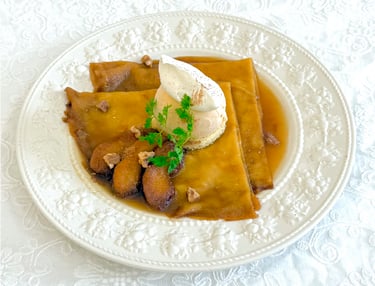 砂糖を焦がし、バターと果汁を加えたソースの中でクレープをじっくりと絡めてフランベします。グランディールでは秋の味覚林檎を使い林檎のブランデーカルバドス香るクレープシュゼットをご用意致しました。キャラメリゼされた林檎の果肉、バニラアイスクリームと共にお召し上がり下さい。